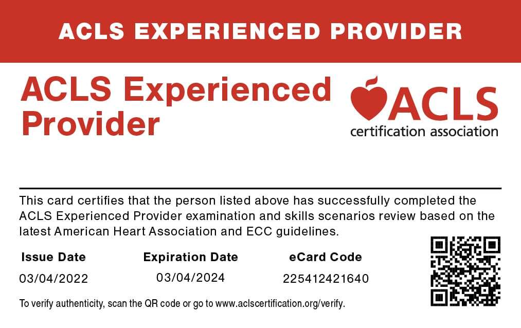 After completing our ACLS experienced provider online certification, your printable certification card is sent directly to your email.