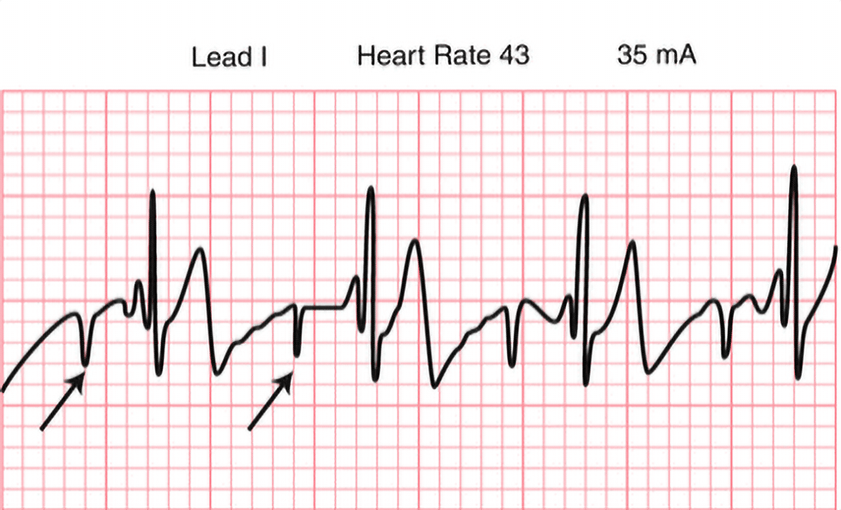 3. A 43-year-old woman has significant hypotension and bradycardia. She has not improved with atropine and epinephrine. Her pulse is thready but palpable. She is being managed with transcutaneous pacing. Her ECG is below:
