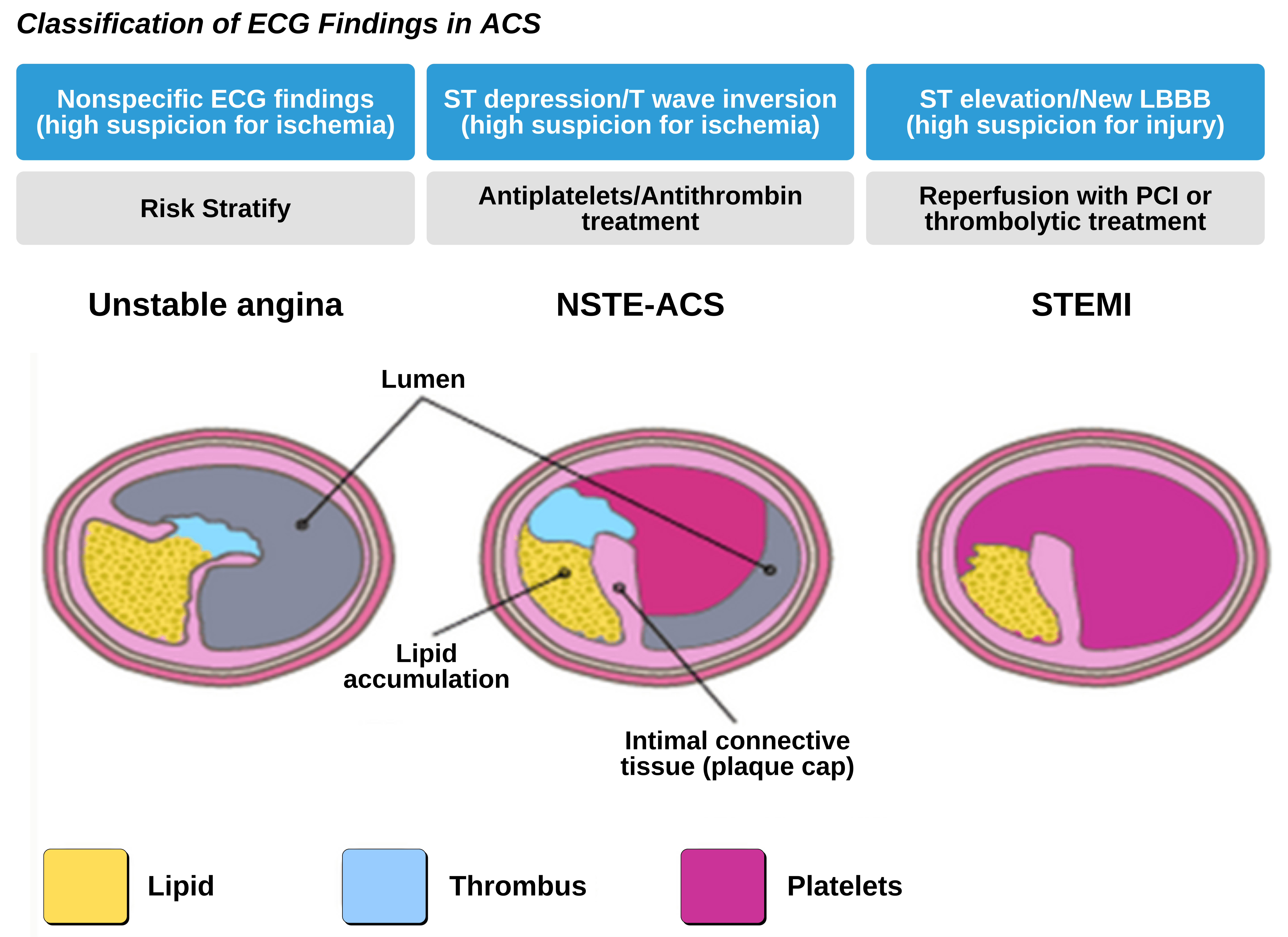 As noted above, any patient with a concern for ACS will need an emergent ECG, as this will help with diagnosing and triaging the disease. The three categories noted above are: