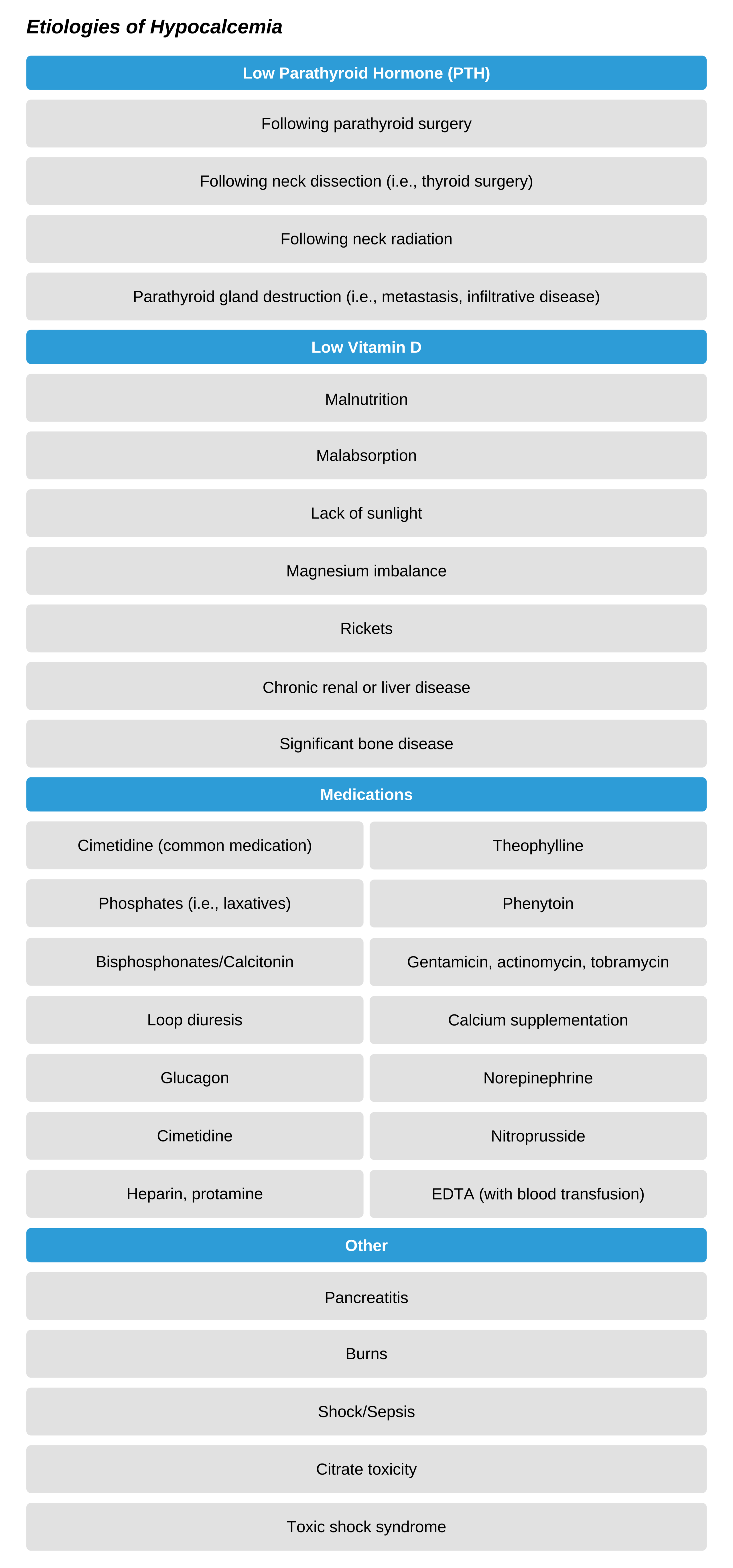 This is less common than hypercalcemia at about 0.6%. It usually is associated with toxic shock syndromes, post thyroid resection, fluoride toxicity, magnesium imbalance, or tumor lysis syndromes (rapid turnover of cells leading to hypocalcemia, hyperkalemia, and hyperphosphatemia). Additionally, common causes include pancreatitis, low vitamin D, and medication complications.