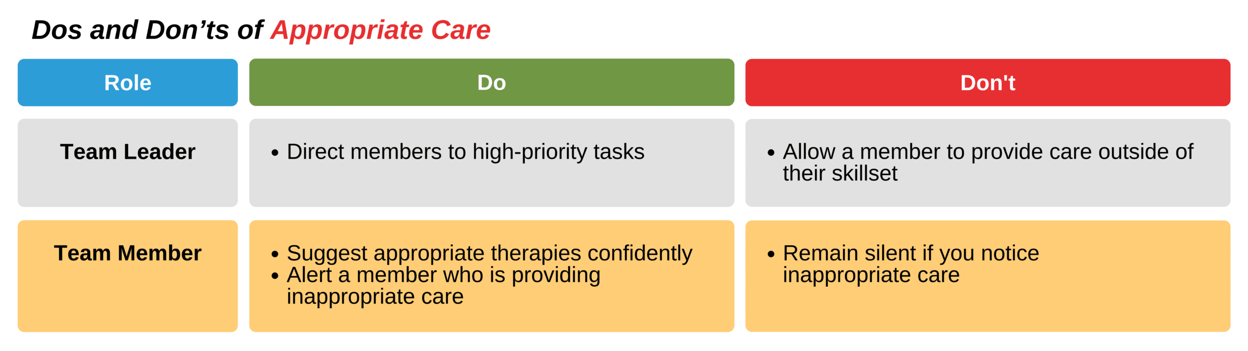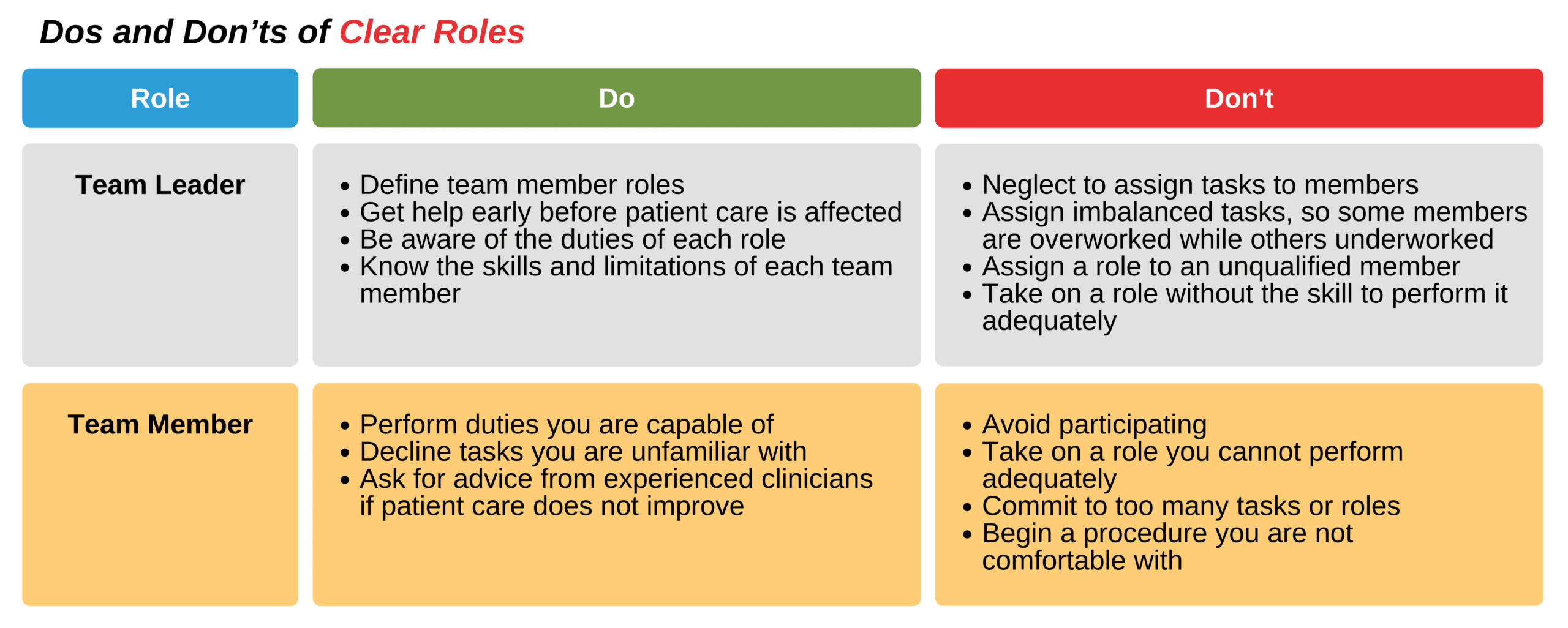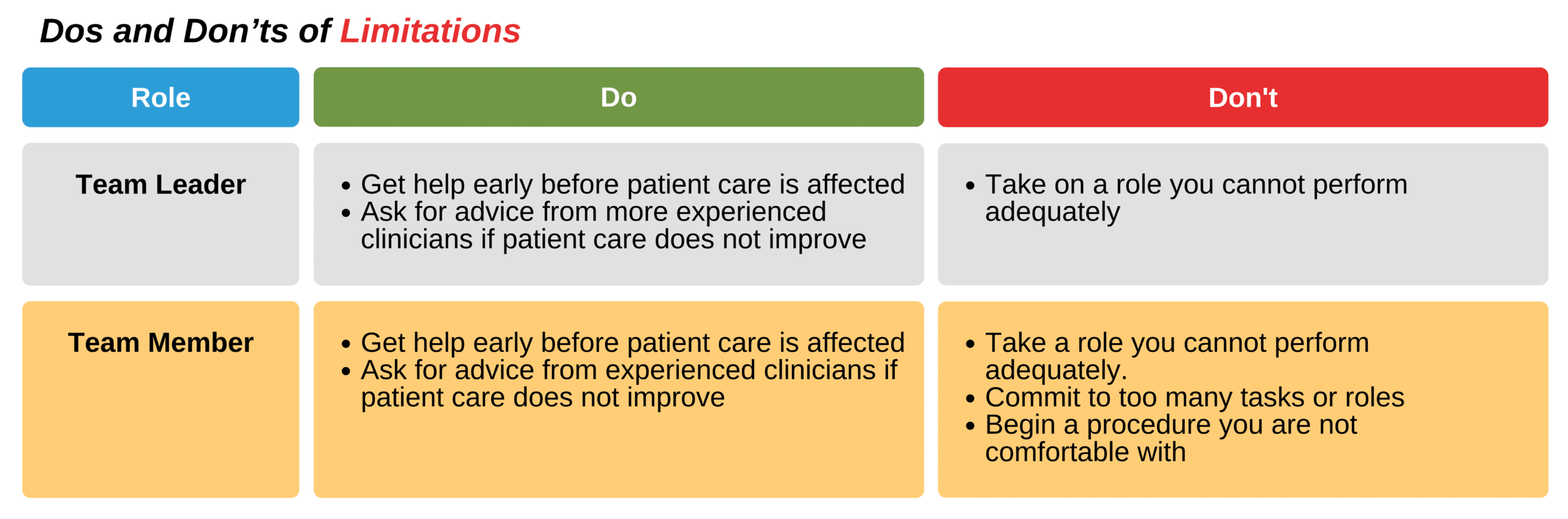 Each team member should be aware of their clinical limitations, as should the team leader. In this way, no one takes on an inappropriate role. The team leader does not assign inappropriate roles and is aware when more assistance is needed. A resuscitation event is not the time to try out a new skill. Instead, it is best for team members to ask for help as soon as it is needed.