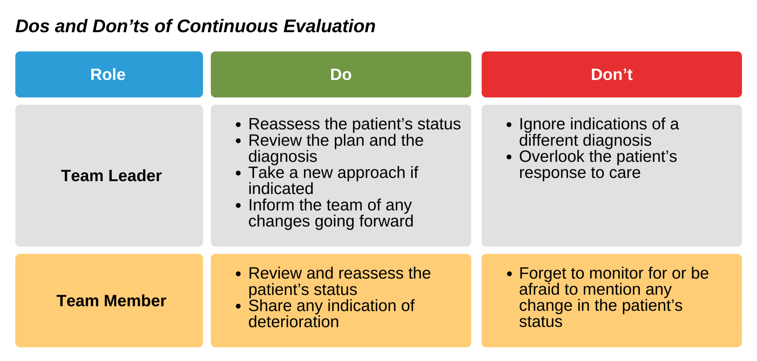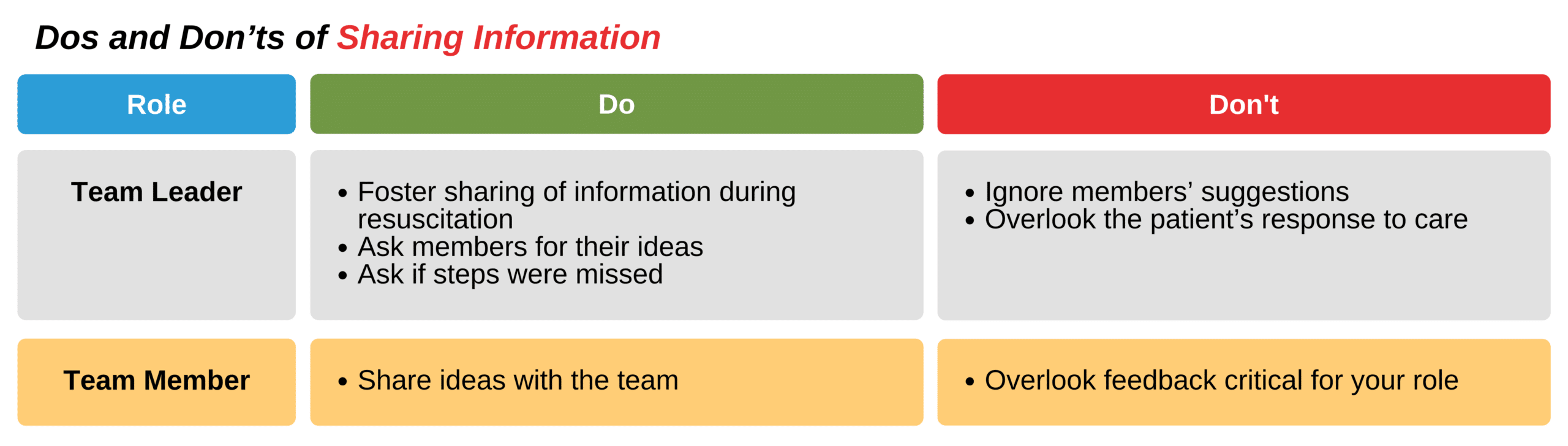 By sharing information, ACLS members prevent stagnant thinking. Occasionally, the team leader may suffer from fixation errors and become overly fixated on a rigid way of thinking. It is vital that if a plan of action is not effecting change, the team is open to reviewing the resuscitation approach and redirecting efforts. Vital to this is continued feedback about the patient’s status to guide care.