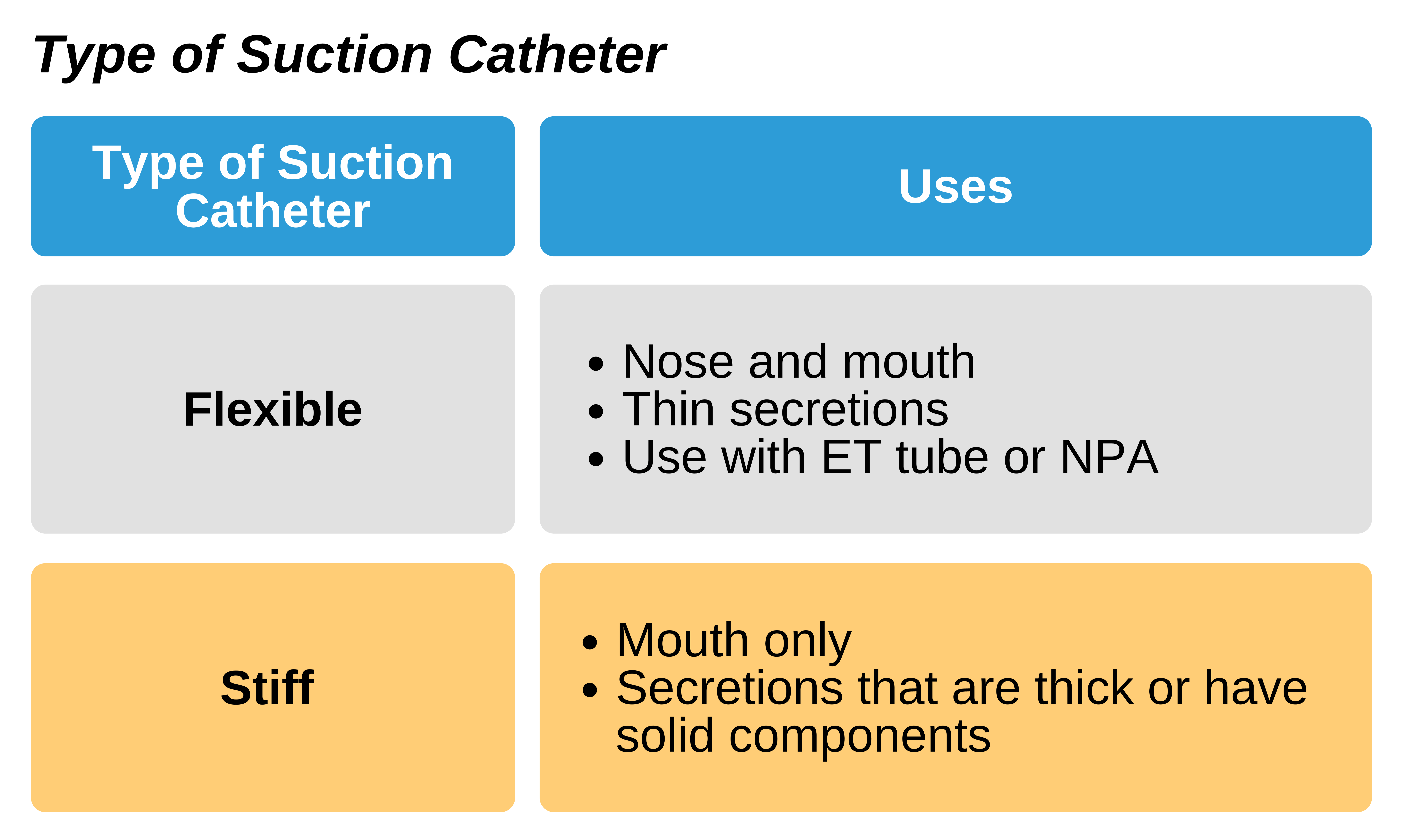 • Stiff suction catheters (e.g., Yankauer suction catheters) are only used via the mouth as they are best for suctioning secretions that are thicker or have solid components.