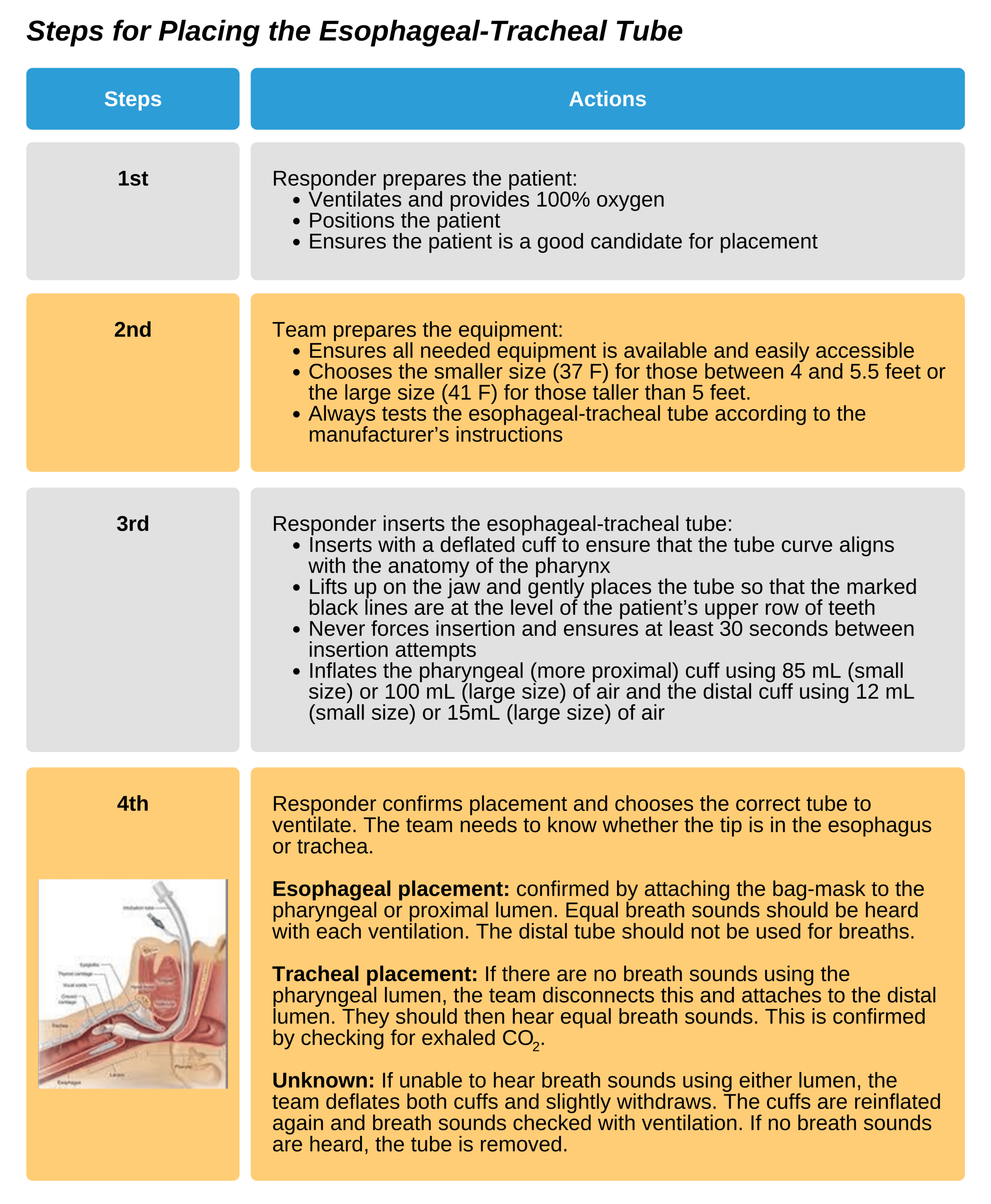 Studies indicate that a wide range of responders can effectively use the esophageal-tracheal tube to ventilate patients. It is a more reliable and secure source of ventilation than the bag-mask. Additionally, training is relatively simple compared to that required for the ET tube. Yet, complications can occur with placement, and all responders using this device should be adequately trained.