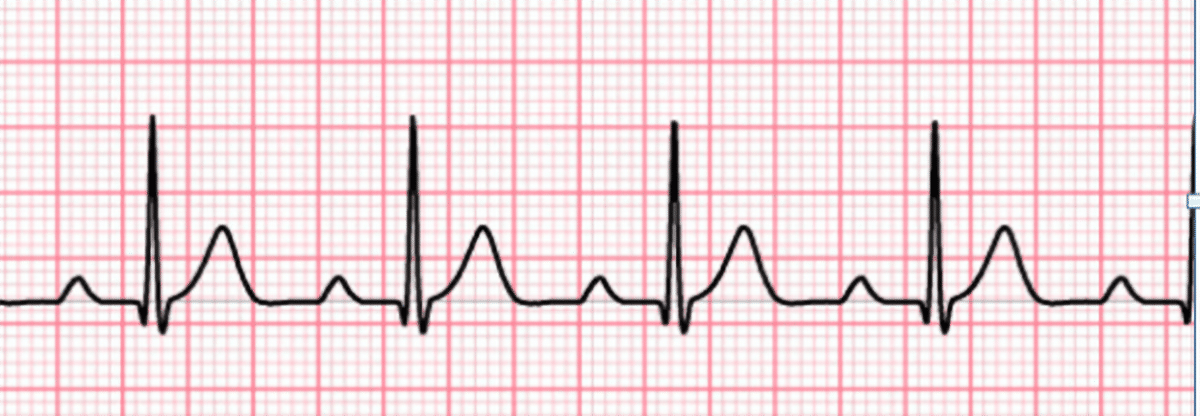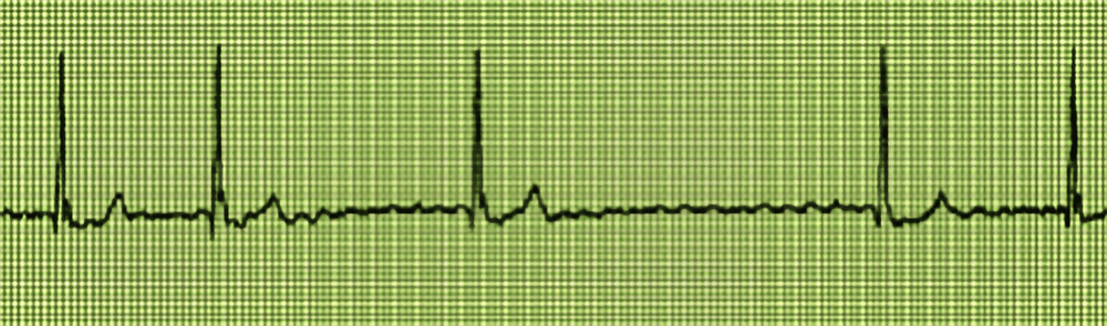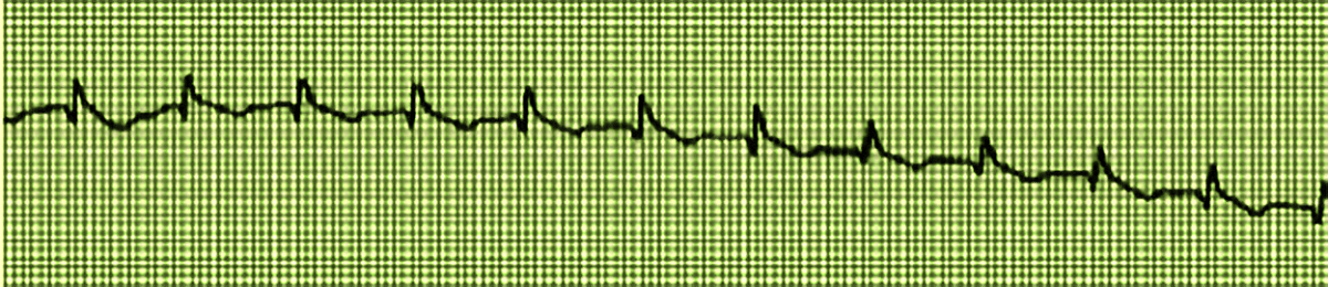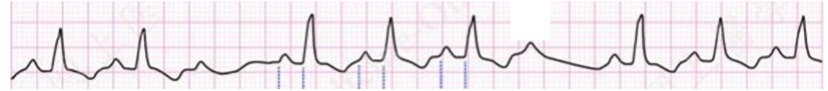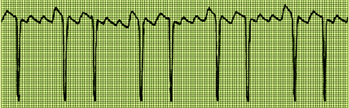 CLUES – regularity: irregular; rate: 60 bpm; P waves: none, undulations present; PR interval: none; QRS: 100 milliseconds.