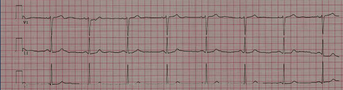 CLUES – regularity: regular; rate: 79 bpm; P waves: upright and uniform with regular P-P interval; PR interval: 200 milliseconds; QRS: 80 milliseconds