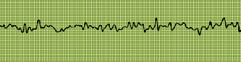 CLUES – regularity: chaotic; rate: cannot be determined; P waves: none; PR interval: none; QRS: none.