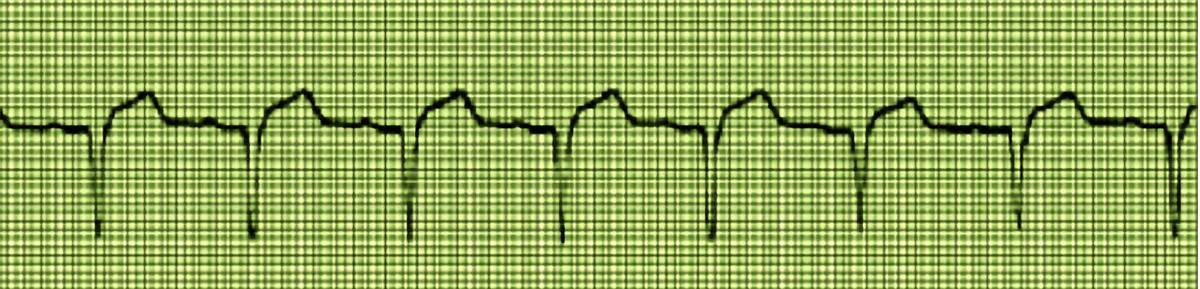 CLUES – regularity: regular; rate: 115 beats per minute; P waves: not visible; PR interval: none; QRS: 80 milliseconds