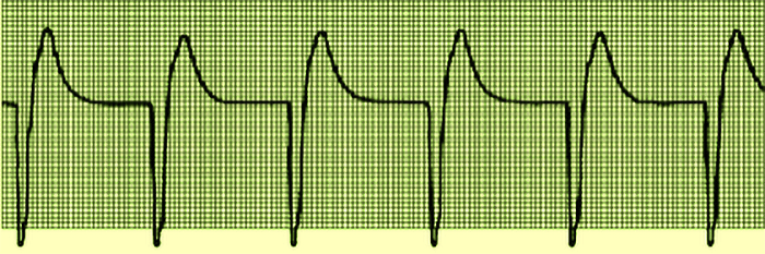CLUES – regularity: regular R-R interval; rate: 300 bpm; P waves: regular P-P interval with saw-tooth appearance; PR interval: none; QRS: 80 milliseconds.